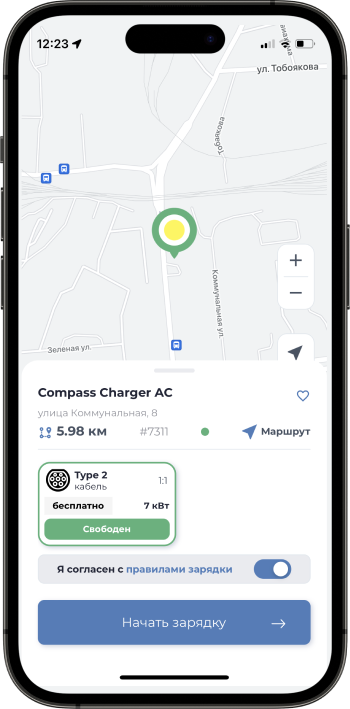 Зарядную сессию можно оплатить через мобильное приложение любым удобным способом (ApplePay, GooglePay), что делает процесс оплаты очень быстрым.